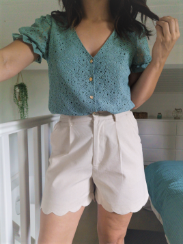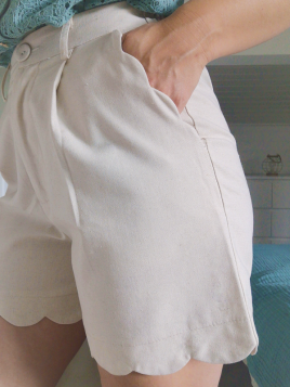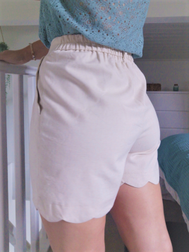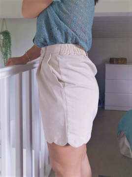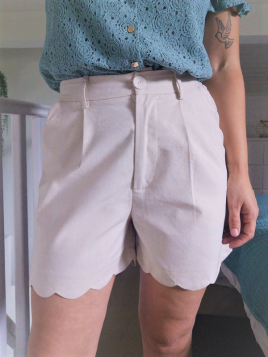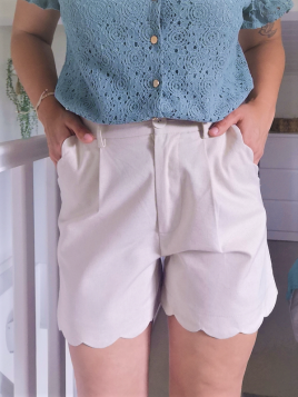 Short beige festonné Un bouton et une fermeture éclair Taille élastique à l'arrière pour plus de confort Deux poches à l'avant Passants pour le porter avec une ceinture Disponible en S, M, et L Notre modèle mesure 1m60 et porte la taille S Elle porte également la blouse Zélya et le...