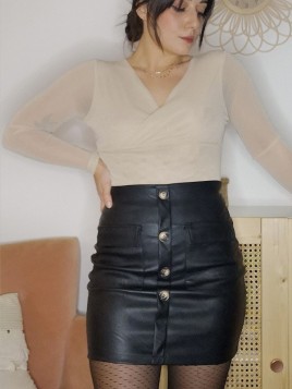 Jupe courte en simili-cuir noir Quatre boutons marbrés sur la longueur Fermeture éclair invisible à l'arrière Deux poches à rabat sur l'avant Coutures ton sur ton Disponible en S, M, L et XL Notre modèle mesure 1m60 et porte la taille M, ainsi que le top Scarlet en beige et en noir