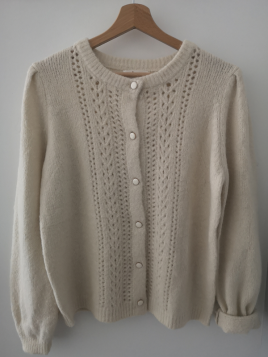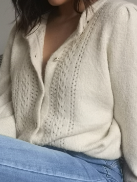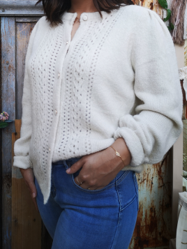 Gilet manches longues Fermeture par 5 boutons sur toute la longueur Boutons de couleur blanc nacré Motif ajouré sur l'avant Effet irisé Manches légèrement bouffantes Très agréable à porter Existe aussi en Noir Disponible en S/M ou M/L Notre modèle mesure 1m60 et porte la taille...