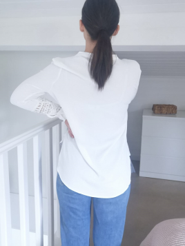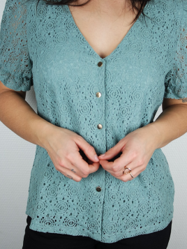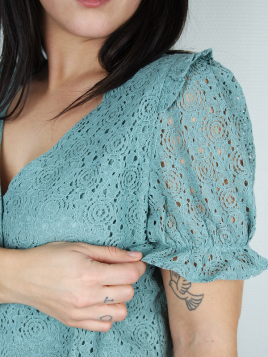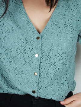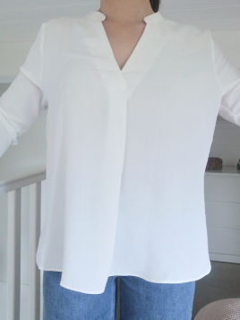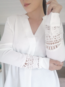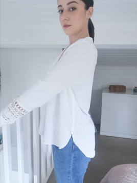 Chemisier en gaze de coton Manches longues Détail ajouté sur l'avant et en haut du dos Patte de boutonnage sur toute la longueur Resserré aux manches avec détail volants et boutons Existe aussi en Blanc Disponible en S, M et L Notre modèle mesure 1m60 et porte la taille S